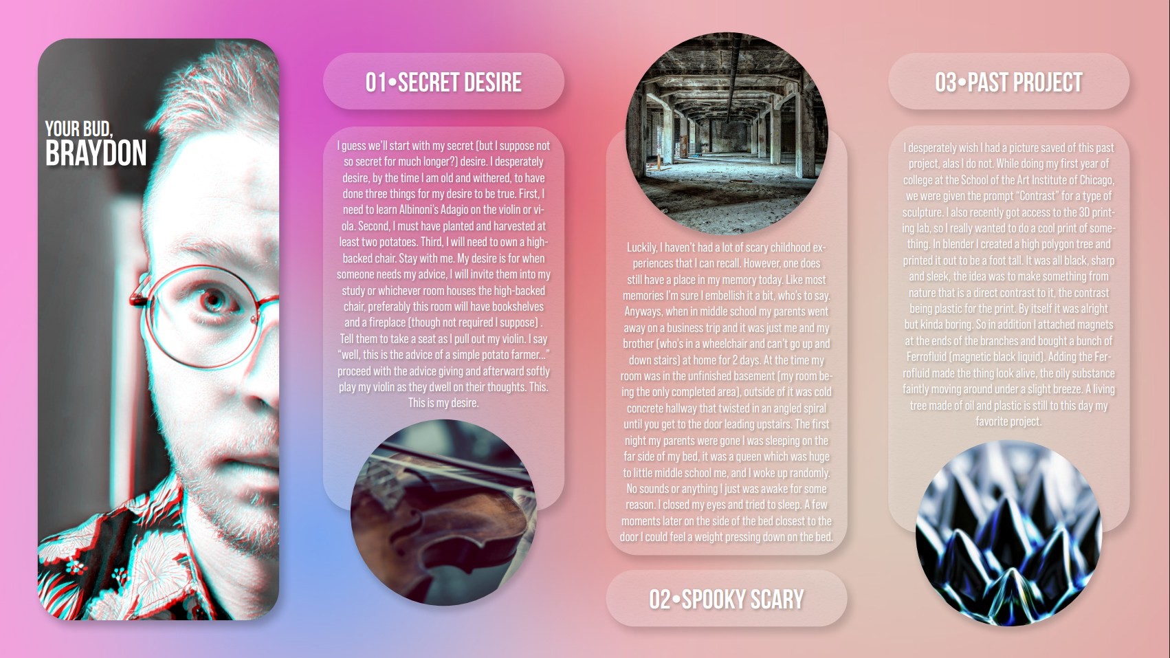 Maybe this is too much information, but previous to coming to Mesa I've made two attempts on my life due to hopelessness towards my future and a string of personal failures (almost failing high school, dropping out of SAIC, quitting job after job). I came to Mesa as my "last chance", and fully intended to be "done" with life if I failed here. Initially the plan was to get my gen-eds out of the way then pursue a philosophy degree and transfer out. While doing that I needed to declare a temporary major, and graphic design seemed like an easy A…